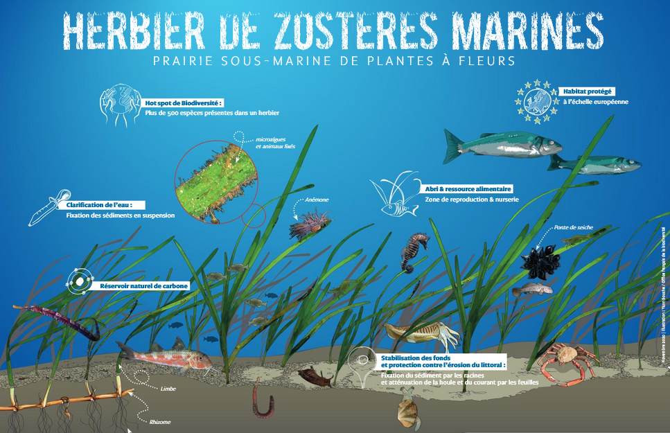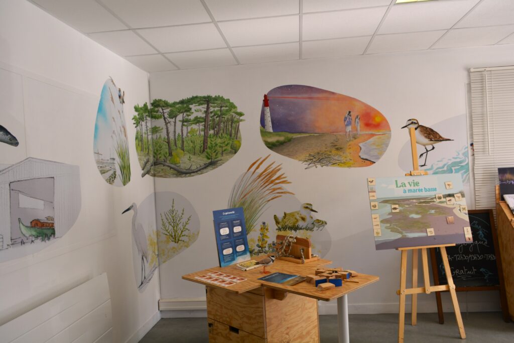 « Cette visite a Ă©tĂ© dispensĂ©e dans l’espace pĂ©dagogique du PNMBA ( Parc Naturel Marin du Bassin d’Arcachon) situĂ© en face du boulodrome de Gujan, trĂšs prĂšs de la gare de Gujan-Mestras. GĂ©rĂ© par l’Office Français de la BiodiversitĂ©, cette aire marine protĂšge 435 km2 d’Ă©cosystĂšmes fragiles. Sa mission est de concilier la prĂ©servation du milieu marin avec les activitĂ©s humaines (ostrĂ©iculture, pĂȘche, nautisme, loisirs). Notre visite a Ă©tĂ© agrĂ©mentĂ©e d’une visite virtuelle des fonds marins du Bassin. Nous dĂ©couvrons que au coeur de ce dispositif, les herbiers de zostĂšres (plantes Ă fleurs marines) jouent un rĂŽle Ă©cologique majeur : ils servent de nurserie Ă la faune, stabilisent les fonds et purifient l’eau en captant le carbone.