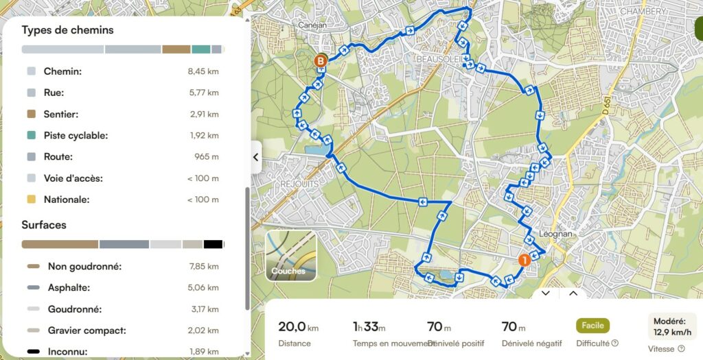 Déroulement : A partir du parking, balade sur chemins, routes secondaires et pistes cyclables (voir plan joint), le long de l’Eau Bourde, vignobles et bois de Léognan, Lac Bleu et Lac Vert.