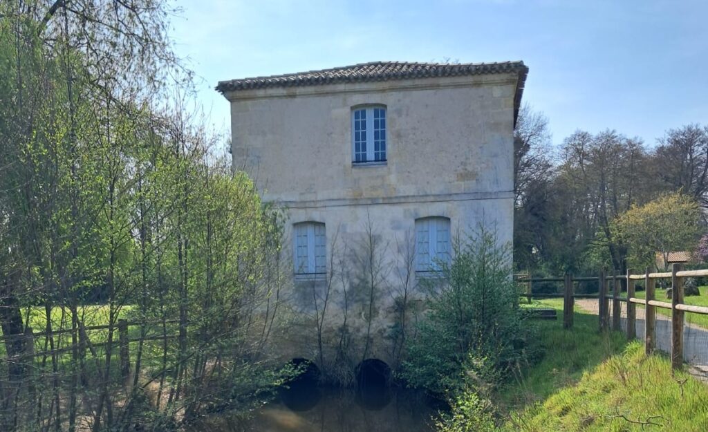 Nous avons d’abord longé le Bois des Sources du Peugue et son petit lac charmant, puis traversé la forêt du Bourgailh pour atteindre le bassin de rétention du même nom, franchi la rocade par la passerelle de Cicéron, emprunté la rue de la Ferme expérimentale et rejoint le dernier vestige de cette ferme qui couvrait 266 Ha à l’époque, le Moulin de Noës.